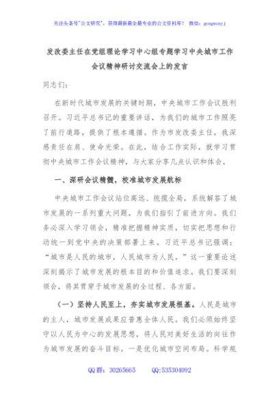 / 发改委主任在党组理论学习中心组专题学习中央城市工作会议精神研讨交流会上的发言