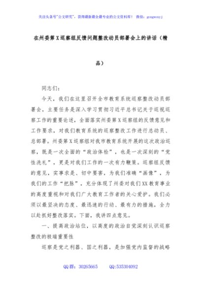 / 在州委第X巡察组反馈问题整改动员部署会上的讲话(精品)