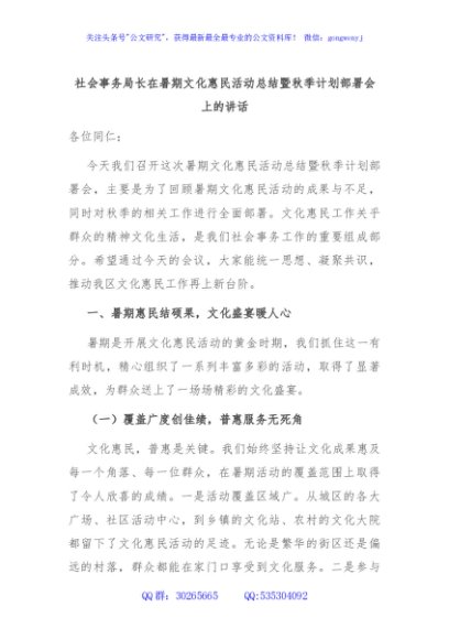 / 社会事务局长在暑期文化惠民活动总结暨秋季计划部署会上的讲话