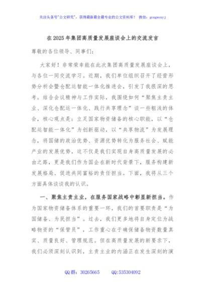 / 在2025年集团高质量发展座谈会上的交流发言