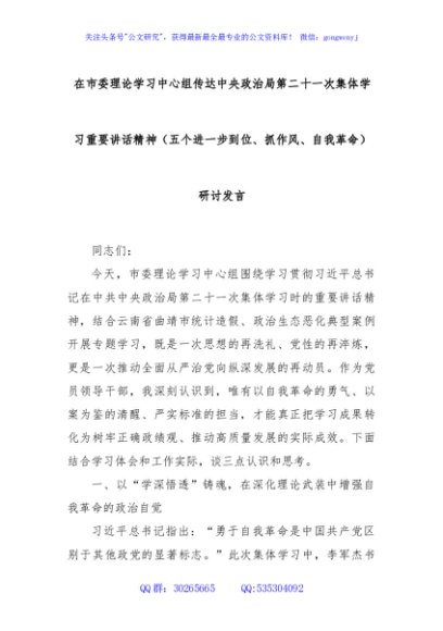 / 在市委理论学习中心组传达中央政治局第二十一次集体学习重要讲话精神(五个进一步到位、抓作风、自我革命)研讨发言