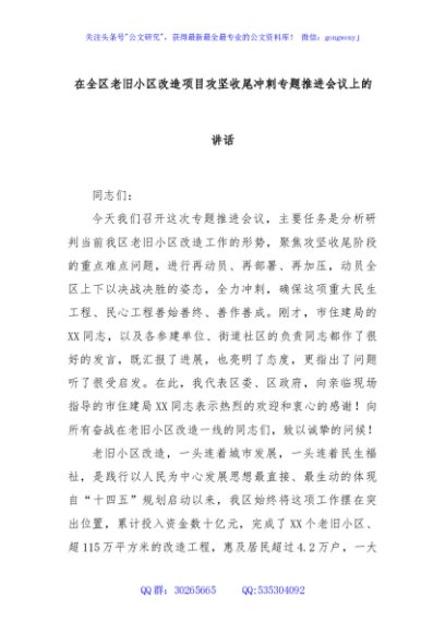 / 在全区老旧小区改造项目攻坚收尾冲刺专题推进会议上的讲话