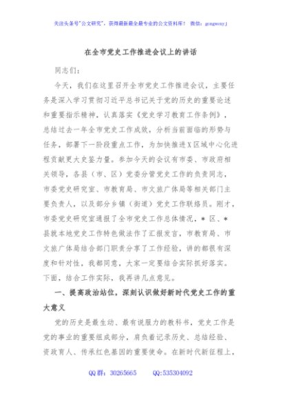 / 在全市党史工作推进会议上的讲话