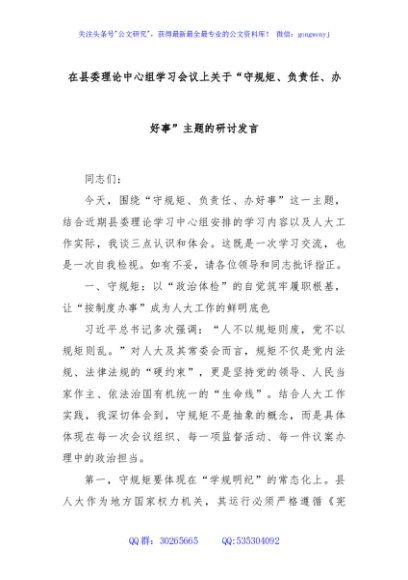 / 在县委理论中心组学习会议上关于“守规矩、负责任、办好事”主题的研讨发言