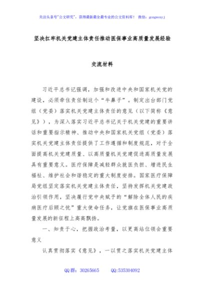 / 坚决扛牢机关党建主体责任推动医保事业高质量发展经验交流材料