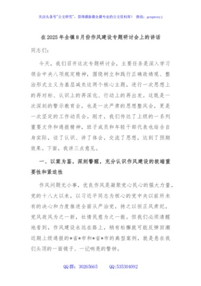 / 在2025年全镇8月份作风建设专题研讨会上的讲话