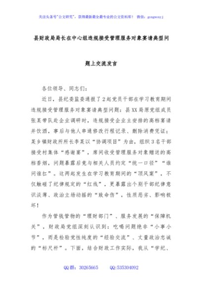 / 县财政局局长在中心组违规接受管理服务对象宴请典型问题上交流发言