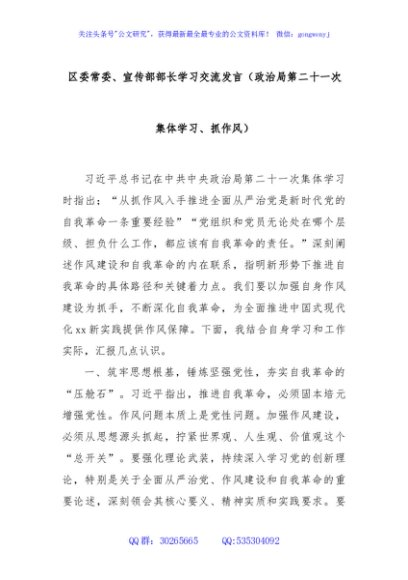 / 区委常委、宣传部部长学习交流发言(政治局第二十一次集体学习、抓作风)