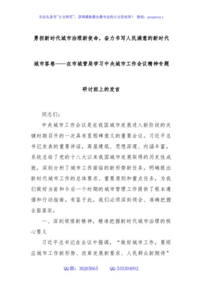 / 勇担新时代城市治理新使命,奋力书写人民满意的新时代城市答卷——在市城管局学习中央城市工作会议精神专题研讨班上的发言