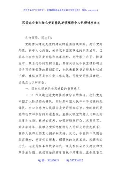 / 区委办公室主任在党的作风建设理论中心组研讨发言2