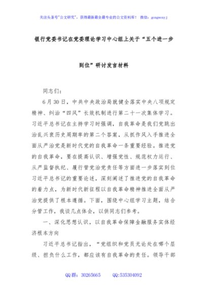 / 银行党委书记在党委理论学习中心组上关于“五个进一步到位”研讨发言材料