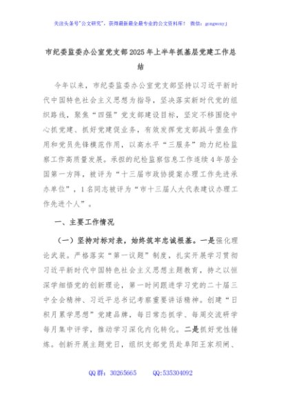 / 市纪委监委办公室党支部2025年上半年抓基层党建工作总结