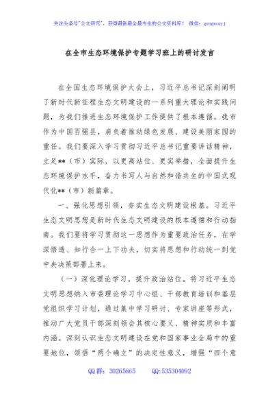 / 在全市生态环境保护专题学习班上的研讨发言