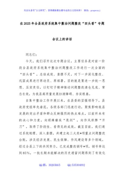 / 在2025年全县政府系统集中整治问题整改“回头看”专题会议上的讲话