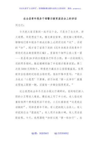 / 在全县青年税务干部警示教育座谈会上的讲话