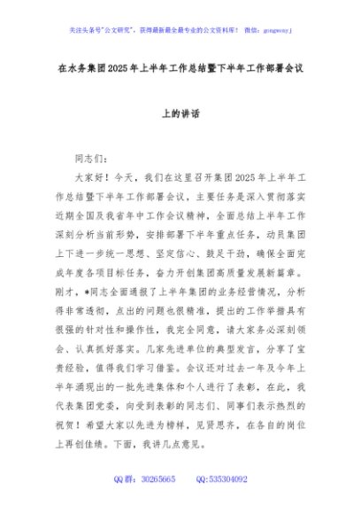 / 在水务集团2025年上半年工作总结暨下半年工作部署会议上的讲话