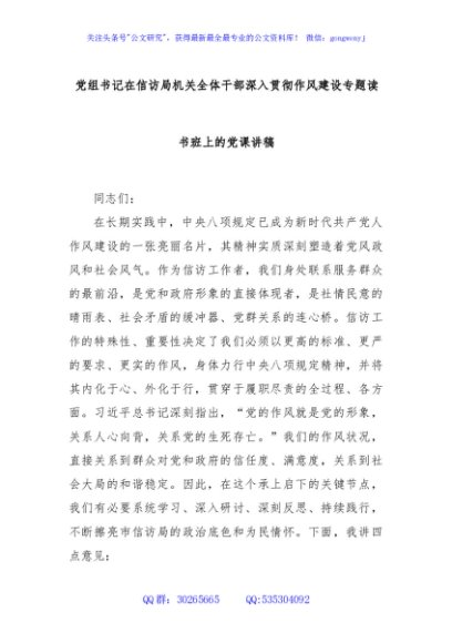 / 党组书记在信访局机关全体干部深入贯彻作风建设专题读书班上的党课讲稿
