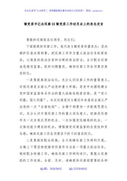 / 镇党委书记在巡察XX镇党委工作动员会上的表态发言