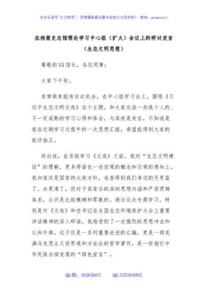 / 在档案史志馆理论学习中心组(扩大)会议上的研讨发言(生态文明思想)