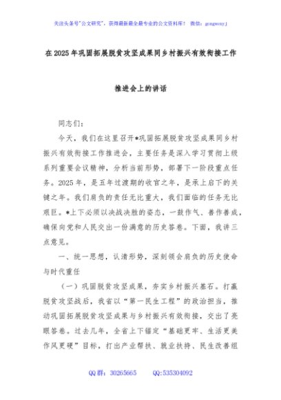 / 在2025年巩固拓展脱贫攻坚成果同乡村振兴有效衔接工作推进会上的讲话