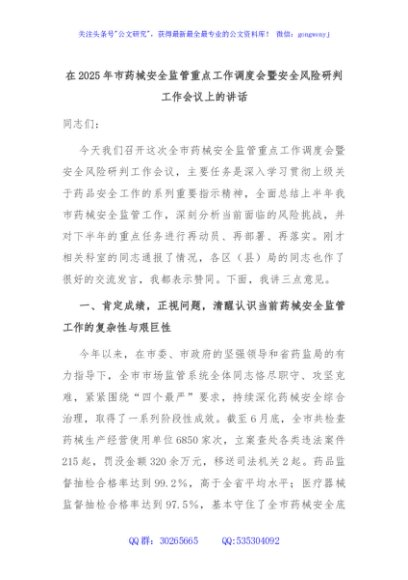 / 在2025年市药械安全监管重点工作调度会暨安全风险研判工作会议上的讲话