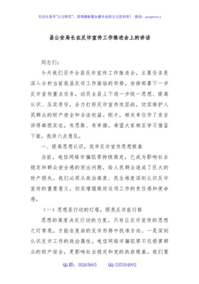 / 县公安局长在反诈宣传工作推进会上的讲话
