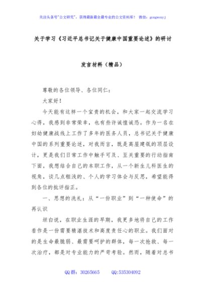 / 关于学习《总书记关于健康中国重要论述》的研讨发言材料(精品)