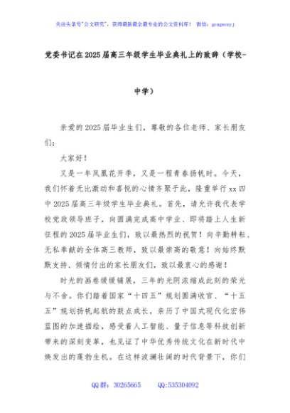 / 党委书记在2025届高三年级学生毕业典礼上的致辞(学校-中学)