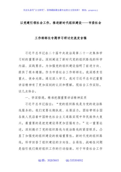 / 以党建引领社会工作,推进新时代组织建设——市委社会工作部部长专题学习研讨交流发言稿