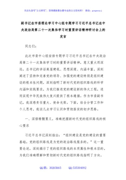 / 副书记在市委理论学习中心组专题学习习近平总书记在中央政治局第二十一次集体学习时重要讲话精神研讨会上的发言