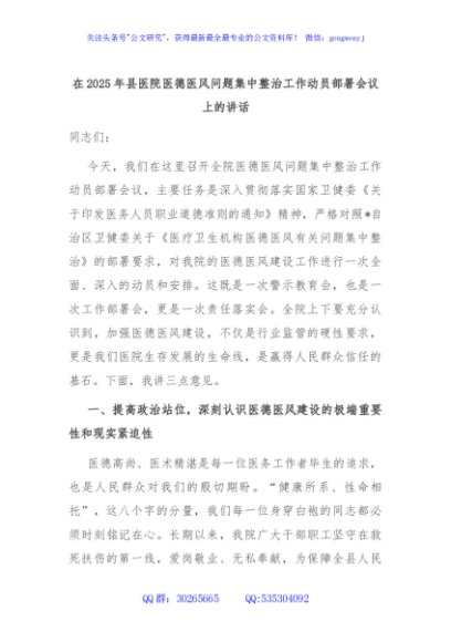 / 在2025年县医院医德医风问题集中整治工作动员部署会议上的讲话