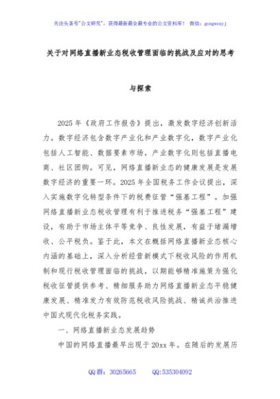 / 关于对网络直播新业态税收管理面临的挑战及应对的思考与探索
