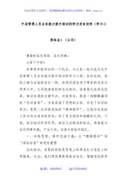 / 中层管理人员业务能力提升培训的研讨发言材料(学习心得体会)(公司)