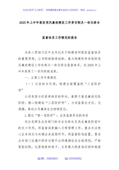 / 2025年上半年落实党风廉政建设工作责任制及一体化综合监督体系工作情况的报告
