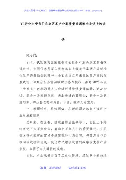 / XX行业主管部门在全区茶产业高质量发展推进会议上的讲话