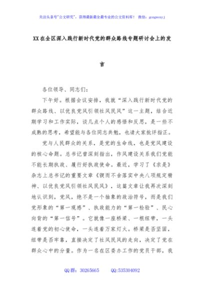 / XX在全区深入践行新时代党的群众路线专题研讨会上的发言
