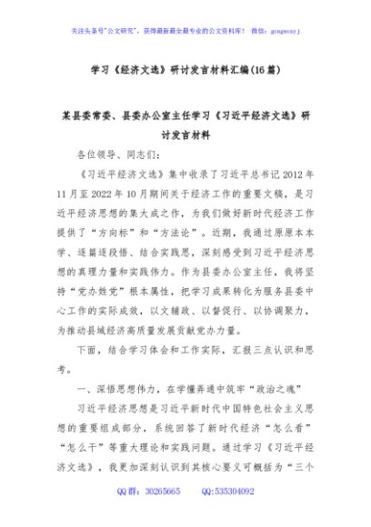 (16篇)学习《经济文选》研讨发言材料汇编