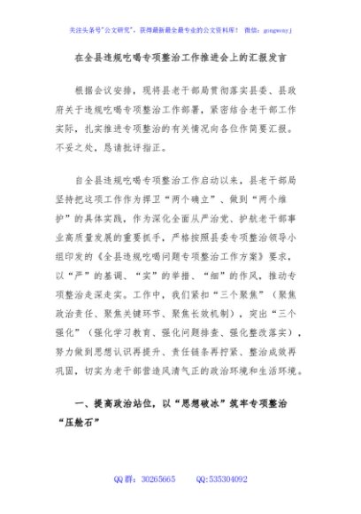 / 在全县违规吃喝专项整治工作推进会上的汇报发言