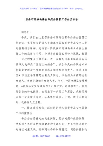 / 在全市网络供餐食品安全监管工作会议讲话