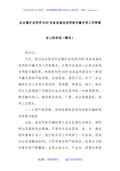 / 在全镇打击利用VOIP设备实施电信网络诈骗专项工作部署会上的讲话(精品)