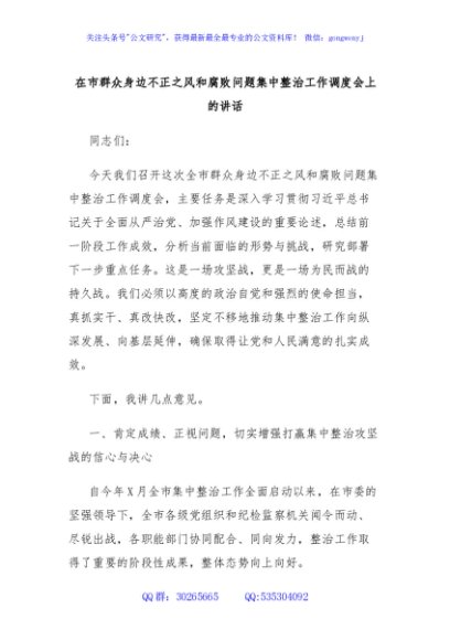 / 在市群众身边不正之风和腐败问题集中整治工作调度会上的讲话