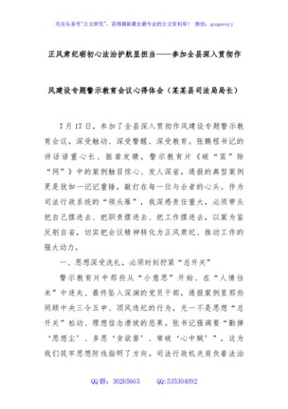 / 正风肃纪砺初心法治护航显担当——参加全县深入贯彻作风建设专题警示教育会议心得体会(某某县司法局局长)