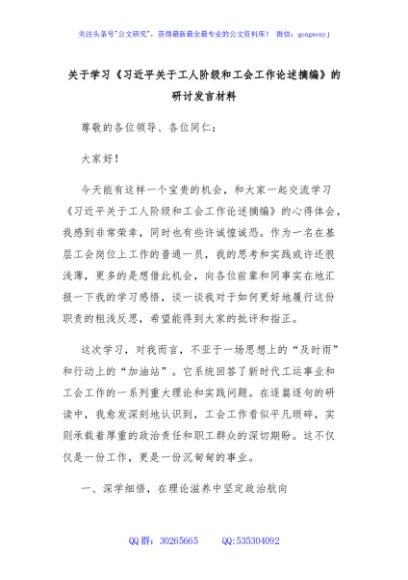 / 关于学习《习近平关于工人阶级和工会工作论述摘编》的研讨发言材料