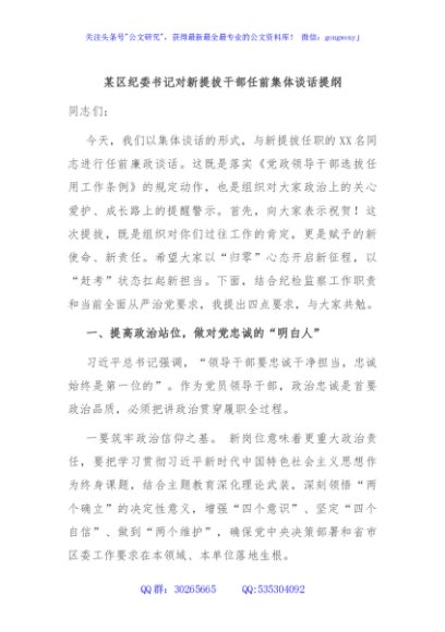 / 某区纪委书记对新提拔干部任前集体谈话提纲