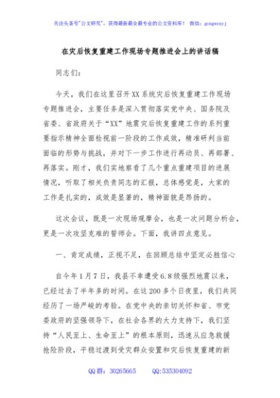 / 在灾后恢复重建工作现场专题推进会上的讲话稿