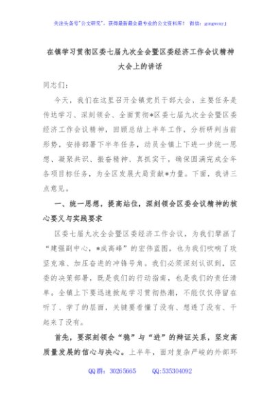 / 在镇学习贯彻区委七届九次全会暨区委经济工作会议精神大会上的讲话