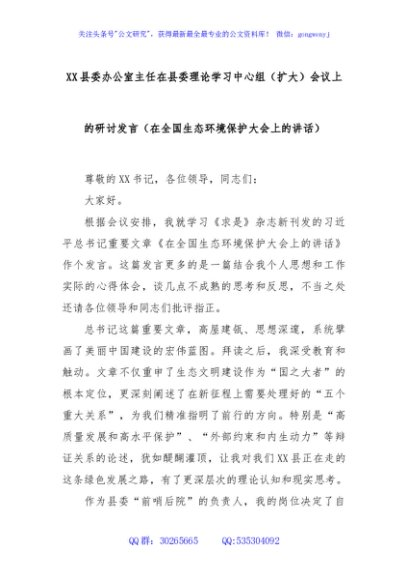 / XX县委办公室主任在县委理论学习中心组(扩大)会议上的研讨发言(在全国生态环境保护大会上的讲话)