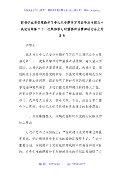 / 副书记在市委理论学习中心组专题学习总书记在中央政治局第二十一次集体学习时重要讲话精神研讨会上的发言