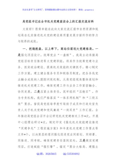 / 局党组书记在全市机关党建座谈会上的汇报交流材料