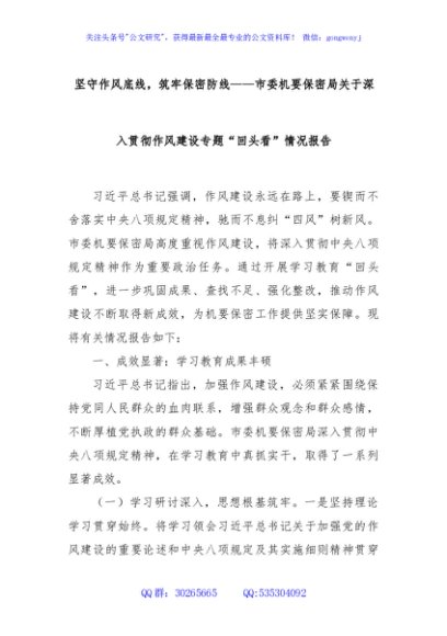 / 坚守作风底线,筑牢保密防线——市委机要保密局关于深入贯彻作风建设专题“回头看”情况报告